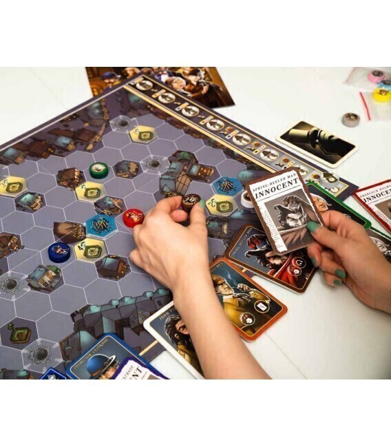 اجزای بازی 6 مهره شخصیت با 6 رنگ گوناگون ، یک سمت با برچسب مظنون و یک سمت با برچسب بی گناه. پیش از بازی، برچسب ها را بر روی مهره های هم رنگ شان بچسبانید. برای نمونه برچسب های سفید را روی مهره سفید بچسبانید. 6 کارت شخصیت با پشت سبز رنگ ، تصویر هر شخصیت روی کارت با نماد خلاصه حرکت و توانایی ویژه. 6 کارت شخصیت با پشت قرمز رنگ ، تصویر هر شخصیت روی کارت نشان داده شده است. 1 توکن مانع برای Joseph Lane’s. 1 توکن " ؟ " برای Professor Moriarty.